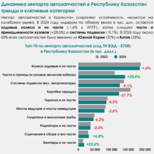 Динамика импорта автозапчастей в Республику Казахстан: тренды и ключевые категории Несмотря на колебания в отдельных товарных категориях, импорт автозапчастей в Казахстан в целом демонстрирует стабильность. В 2024 году лидером по объему ввоза в тыс. дол. остаются ходовые колеса и их части, хотя объемы снизились на 1,6% по сравнению с 2023 годом. На втором месте по объему ввоза — части и...Читать далее